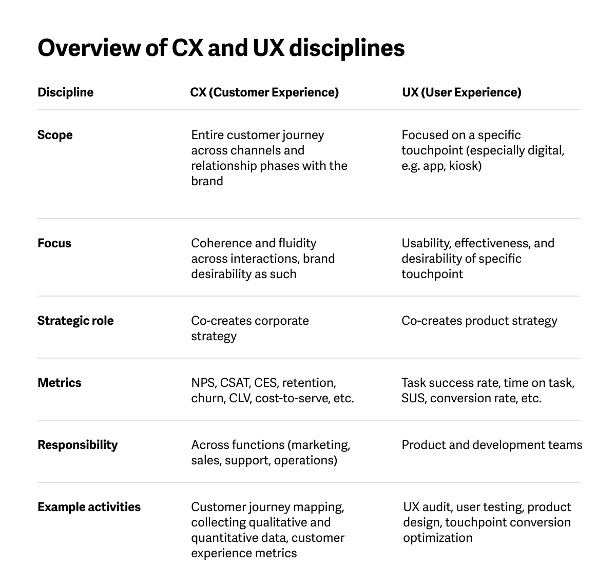 - The disciplines have different roots (CX more in marketing, services, and operations; UX in HCI/HCD), but are gradually converging